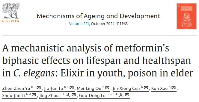 [1] Zhen-Zhen Yu, Jia-Jun Tu, Mei-Ling Ou, Jin-Xiong Cen, Kun Xue, Shao-Jun Li, Jing Zhou, Guo-Dong Lu,A mechanistic analysis of metformin's biphasic effects on lifespan and healthspan in C. elegans: Elixir in youth, poison in elder,Mechanisms of Ageing and Development,Volume 221,2024,111963,ISSN 0047-6374